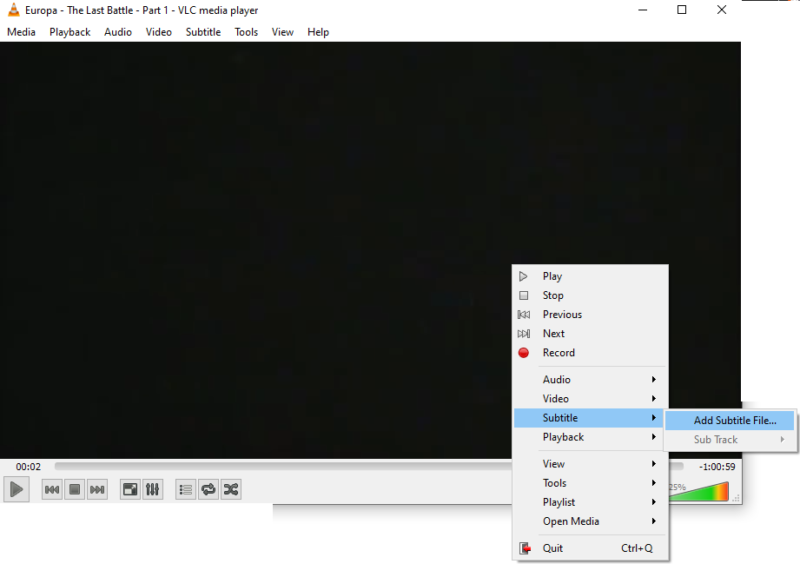 - Deschideți documentarul folosind VLC Media Player, apoi dați click dreapta pe ecran, Subtitle – Add Subtitle File, selectând fișierul pe care l-ați descărcat adineaori.
