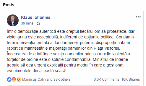 Punctul culminant a fost declarația președintelui Klaus Iohannis (făcută pe FB) în care condamna jandarmeria pentru intervenția fizică asupra protestatarilor.