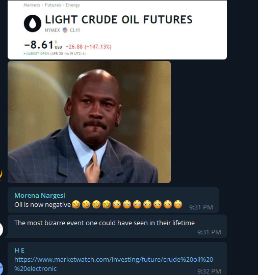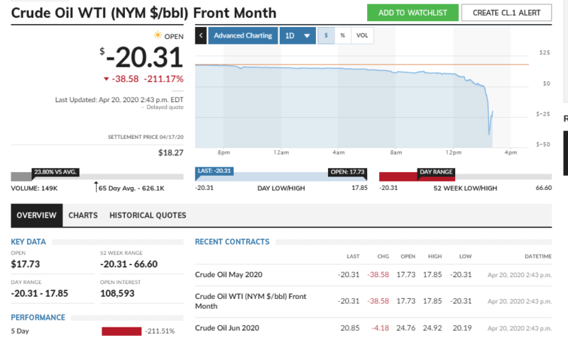 Când prețul e negativ înseamnă că vânzătorii nu mai au unde-l depozita și te plătesc ca să-l depozitezi tu. Din cauza scăderii cererii cauzate de stoparea transporturilor și a fabricilor de producție, practic producătorii sunt nevoiți să plătească pentru a scăpa de petrol.