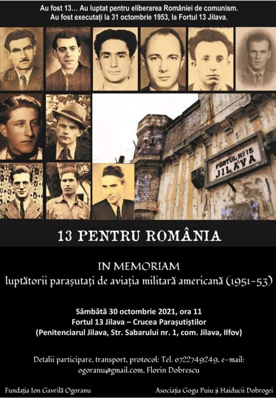 Comemorarea anuală a luptătorilor anticomuniști parașutați de aviația militară americană între 1951-53 și executați la Fortul 13 Jilava, alături de susținătorii lor locali, va avea loc sâmbătă 30 octombrie 2021, ora 11, la Crucea Parașutiștilor din spatele Fortului 13 Jilava (platoul de deasupra Văii Piersicilor).