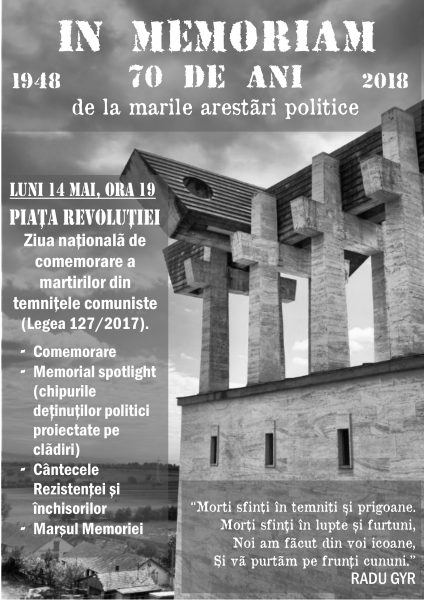 Anul acesta, pe 14 mai, în Piața Revoluției (Palatului Regal) din Capitală, pentru prima oară martirii temnițelor comuniste vor fi comemorați conform Legii 127/2017.
