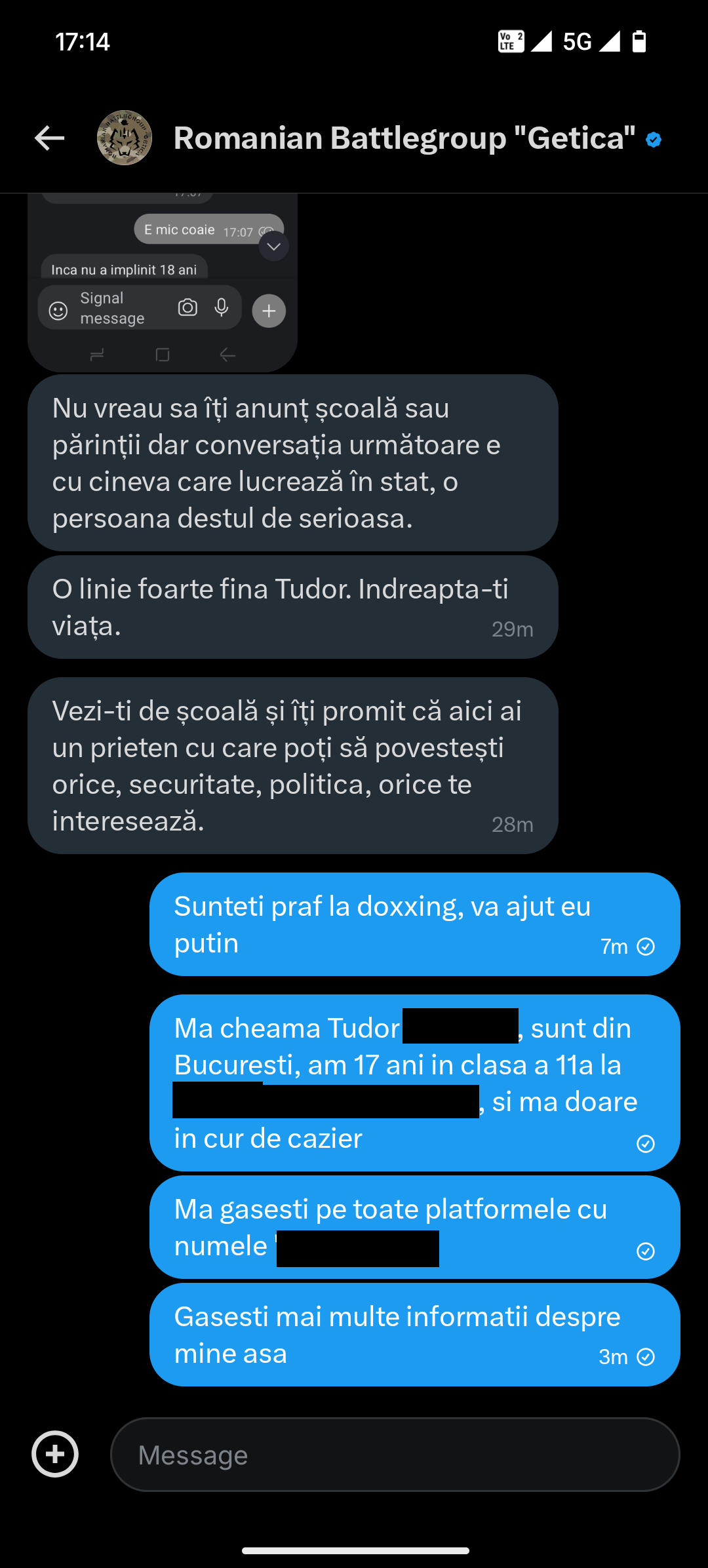 Credeam că există un război în Ucraina (pe care Zelenskyi îl pierde fără grație). Nu au un front de ținut? Nu au de luptat împotriva rușilor? Ce caută bărbații ăștia luptând din tastatură și amenințând adolescenți pe Internet? Vedeți cum l-au amenințat că o să-i sune școala, familia și o să-i facă probleme. Totuși…cei de la Getica au avut ghinionul să întâlnească un tânăr mai curajos decât ei, care nu s-a îndoit în fața amenințărilor și nici n-a pus botul la “promisiunile” otrăvite.