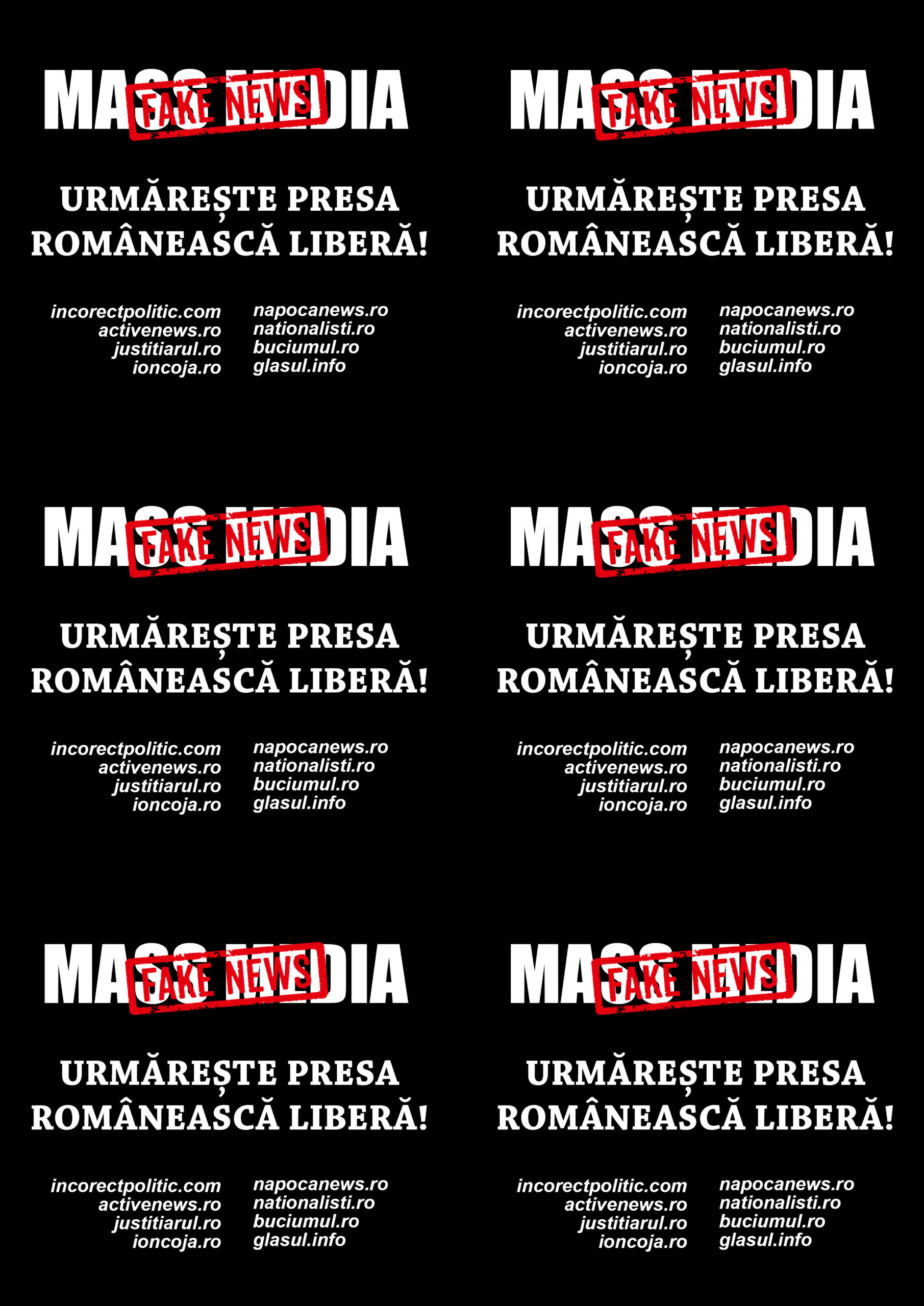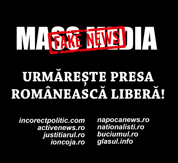 Nota redacției Incorect Politic: Întoarce expresia împotriva lor, mass media = fake news. Imaginea de mai sus poate fi descărcată AICI. Cu ea se poate merge la orice imprimerie pentru fi trasă pe autocolant. Orice gest de dizidență, cât de mic, este apreciat în lupta pentru adevăr. Distribuie prin oraș, lipește pe stîlpi, în stații.