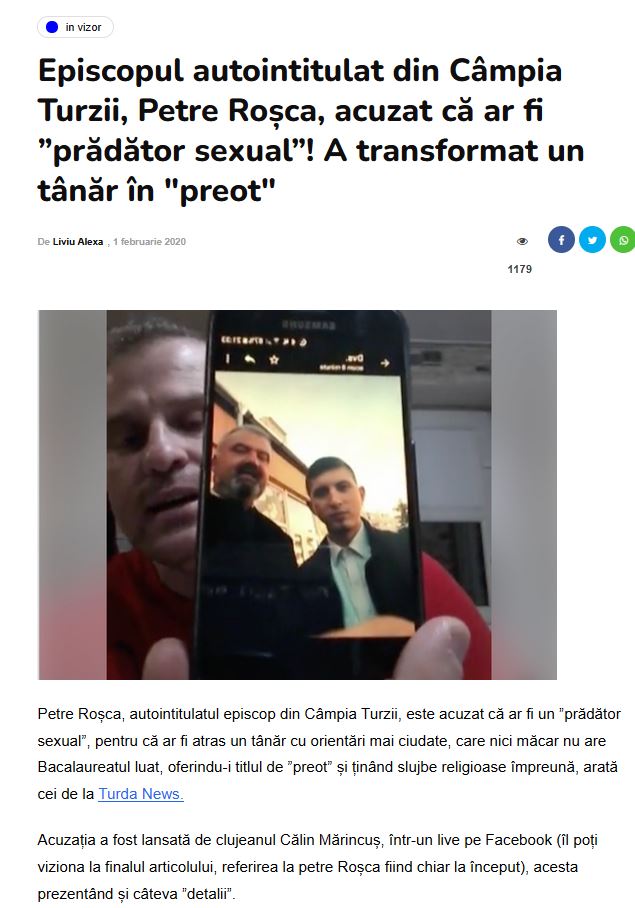Petre Roșca, un fost cantor al unei Biserici ortodoxe din Câmpia Turzii s-a autointitulat diacon. Alături de el, l-a luat pe un tânăr pe care l-a intitulat preot acesta din urmă fiind în trecut tot cântăreț al unei biserici. Tânărul proclamat diacon de către Petre Roșca este implicat într-un scandal sexual cu un alt preot din Mureș care este căsătorit și are și un copil. Legăturile amoroase, plăcerile și fanteziile sexuale dintre cei doi au fost date în vileag!