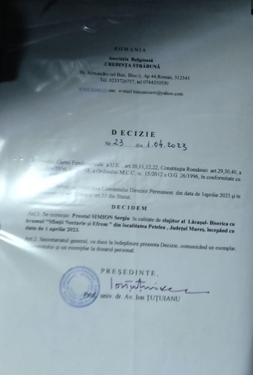 Actualmente, acesta și-a făcut Biserică în localitatea Petelea, județul Mureș, a făcut parte din 3 asociații religioase până acum (Asociația Religioasă Credința Străbună, Asociația Religioasă Biserica Ortodoxă Valahă, Asociația Religioasă Închinată Tatălui și Fiului și Sf. Duh), unde face noaptea slujbe (miercuri și vineri), unde oamenii merg pentru probleme, dar aceștia sunt înșelați de către acest “afurisit”, care nu este preot, ci este un om de etnie care a fost Penticostal (Tatăl acestuia, fost predicator penticostal). Acesta face bani mulți (aprox. 4000-10000 lei pe slujbă), dar nu a contribuit cu nimic la biserică. Ba mai mult, acesta și-a făcut și casă în spate. Vecinii spun că a cumpărat pământ de la un Domn vecin pe nume Telu, care i-a vândut pământul cu 10.000 de euro.