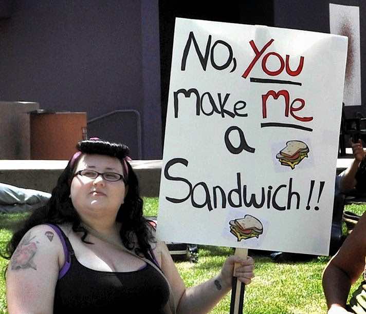 Femei-pantalon-falus dominatoare și castratoare cu țigara în gură care urlă, totuși, nu suntem obiecte sexuale, vrem egalitate și respect!… Bine dom’le!