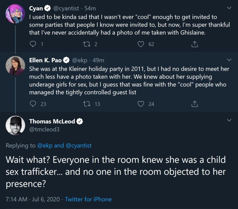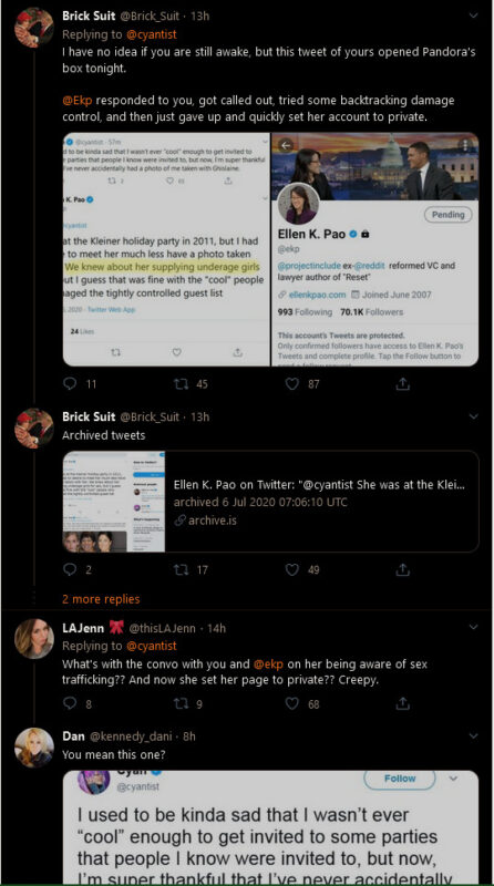 – La această postare, fosta CEO Reddit, Ellen Pao, a răspuns că Ghislaine a fost prezentă la o petrecere de sărbători în 2011, dar Pao nu dorise să o întâlnească sau să își facă o poză cu ea. Cităm:  *Știam că procura minore pentru sex, dar probabil asta era în regulă cu oamenii “cool” care se ocupau de lista de oaspeți, foarte controlată de altfel