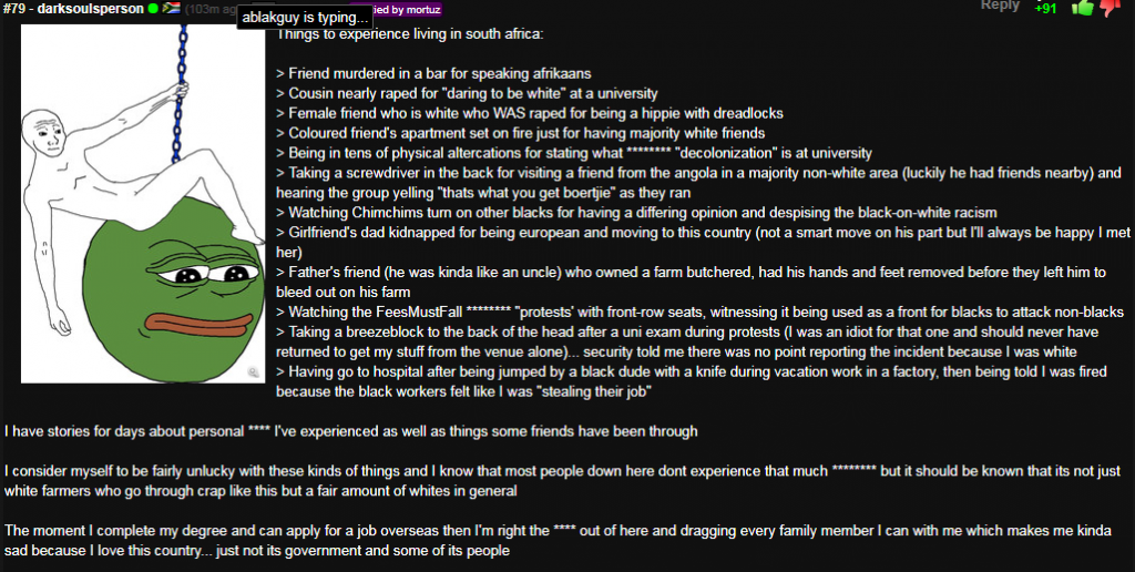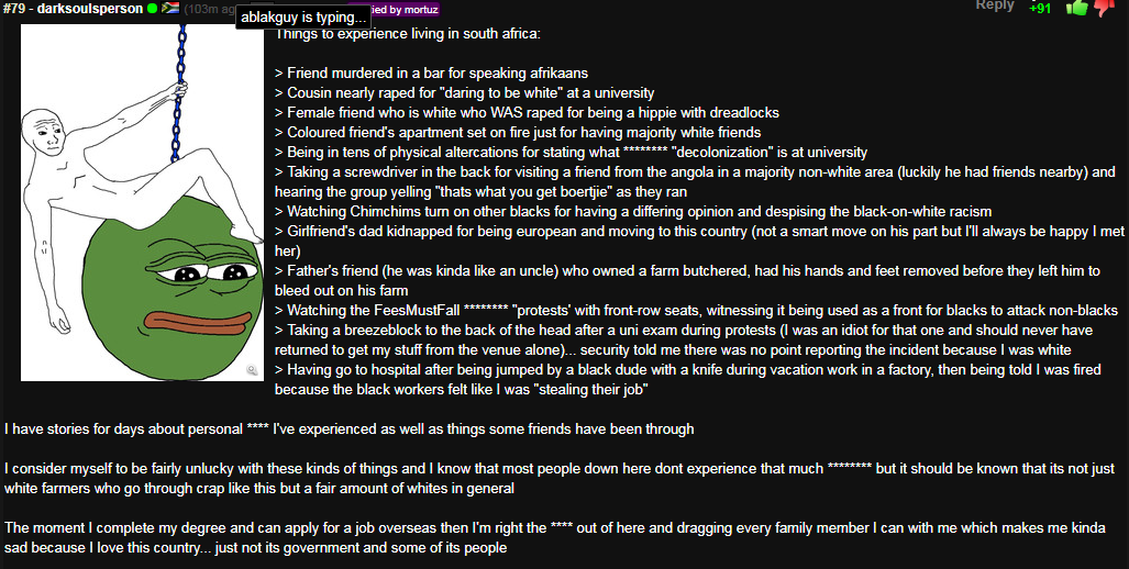 Just go look up on farm murders in South Africa. See the horrible and painful deaths these people suffer. Woman, children, even months old BABIES. All because f the colour of their skin.
