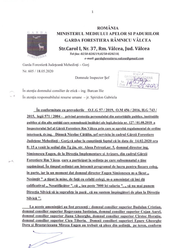 “În conformitate cu prevederile O.U.G 57 / 2019, O.M 456 / 2016, H.G 743 / 2015, legii 571 / 2004 – privind protecţia personalului din autorităţile publice, instituţiile publice şi din alte unităţi care semnalează încălcări ale legii,decizia nr. 127 / 01.08.2018 a Inspectorului Șef al Gărzii Forestiere Rm Vâlcea prin care se aprobă regulamentul de ordine interioară, dr.ing. Dinucă Nicolae Cătălin, șef serviciu în cadrul Gărzii Forestiere Județene Mehedinți – Gorj,vă aduc la cunștiință faptul că în data de 14.02.2020 ora 8: 15 a venit la sediul din Tg. Jiu, str. Aleea Petrești, nr. 5, domnul director ing. Simionescu Eugen, de la Direcția Implementare și Avizare, din cadrul Gărzii Forestiere Rm. Vâcea, care a participat la sedința pe care subsemnatul o ține sapămânal. În timpul sedinței am întocmit programul de lucru pentru fiecare coleg, în parte, iar la un moment dat domnul director Eugen Simionescu m-a făcut ,, Nesimțit ”, a țipat la mine, de față cu celalți colegi, m-a amenințat că îmi dă calificativul ,, Nesatifăcător ”, că ,, iau peste 7000 lei salariu ”, ,, să nu mai punem Direcția Silvică să ia suprafețe în pază , că nu suntem împingători de plan la Direcția Silvică ’’.
