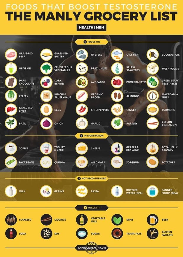 Preluată dintr-un articol mai larg de pe Daily Stormer, lista conține alimente care contribuie la creșterea nivelului de testosteron din organism, în condițiile în care studiile arată că astăzi avem cu 50% mai puțin testosteron decât bunicii noștri.