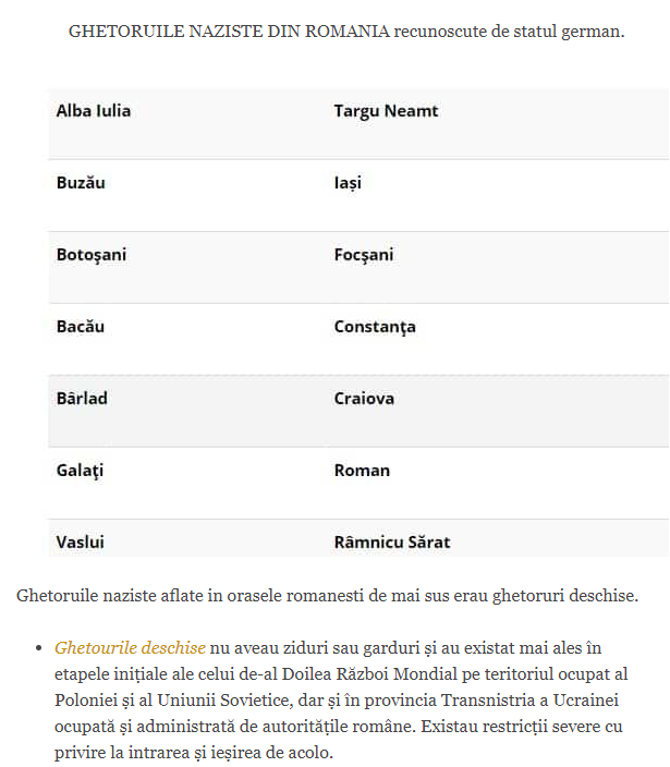 Şi Bucurestiul a fost trecut pe listă, introdus ca “ghetou deschis” (un non-sens) în 2021, de Germania, ca să mai ia rente nemeritate şi alţi de evrei (pe lângă cei care deja primeau „indemnizaţiile lunare“ de la Germania şi de la România), care au fost în Bucureşti în timpul războiului, sau să ia pensia urmaşii lor. Ştire chiar de pe Incorect Politic: