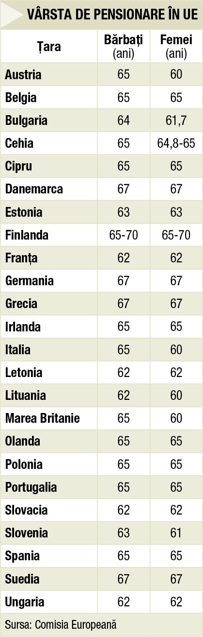 Vârsta standard de pensionare în România este acum de 65 de ani pentru bărbaţi şi 63 de ani pentru femei. Klaus Werner Iohannis și guvernul său marionetă intenționează să ridice vârsta de pensionare la 70 de ani pentru ambele sexe. Ca de obicei, ticăloșii care conduc țara se oferă din exces de zel să fie cobaii Europei, la fel ca în cazul introducerii Codex Alimentarius în România și a Organismelor Modificate Genetic (OMG) la scară intensivă. Din cauza adezivului Initium din produsele de panificaţie au explodat cazurile de cancer şi de diabet. România este unica ţară din UE care a aprobat Codex Alimentarius, OMG și Initium.