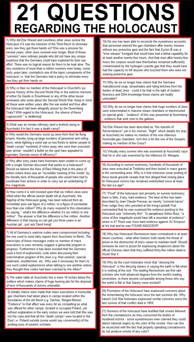 Niciodata nu s-a facut plangere si nici vreun rezumat despre furnalele de la Auschwitz folosite la gazarea oamenilor, nici macar o data, nici in raportul din 1946 de 1600 de pagini. Nu face referire deloc nici la cabinele de dus ascunse pentru a emana gaz si utilizate la executii in masa. Pentru a comunica importanta acestei informatii, in biografia lor de dupa razboi, nici macar o data David Eisenhower, W. Churchill, de Gaulle sau H. Truman n-au facut nici cea mai mica referire despre lagarele de concentrare din Germania sau din tarile ocupate de germani. In plus, in timpul razboiului, nici Crucea Rosie, nici vreo alta organizatie umanitara, nici Vaticanul, nici vreun guvern aliat n-au abordat subiectul unui Holocaust care ar fi exterminat 6 milioane de evrei.