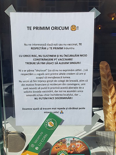 Patronii localului LaCorn se pronunță împotriva segregării sociale pe criterii de (ne)vaccinare și spun că această măsură li se pare una destinată învrăjbirii oamenilor, motiv pentru care ei refuză să facă diferențe între nevaccinați și vaccinați, primindu-i înăuntru și pe unii și pe alții, fără discriminare.
