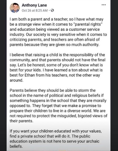 The controversy over the drag queen’s presence in the school intensified when Lane reportedly posted his criticism of parents expressing concern about the event to Facebook.