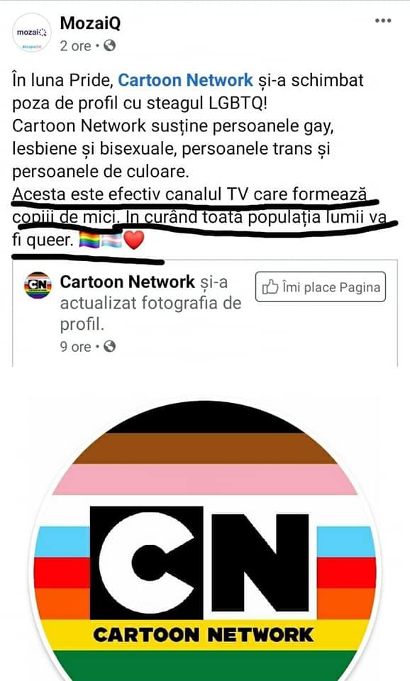 Cartoon Network susține persoanele gay, lesbiene și bisexuale, persoanele trans și persoanele de culoare.Acesta este efectiv canalul TV care formează copiii de mici. În curând toată populația lumii va fi queer”, au scris adepții acestei ideologii.