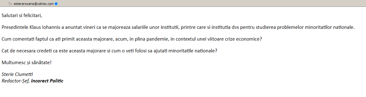 În acest sens am trimis un email Esterei, întrebând-o cum comentează mărirea neașteptată anunțată de Iohannis și cum o va folosi pentru a ajuta minoritățile.