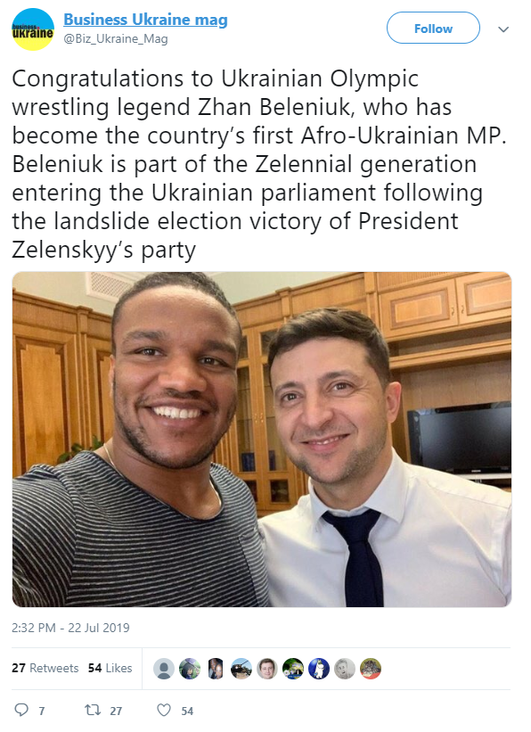 Președintele Volodomyr Zelenskyy, vă prezintă primul deputat african din Ucraina – (((ales democratic))) – în numele partidului său israelit.