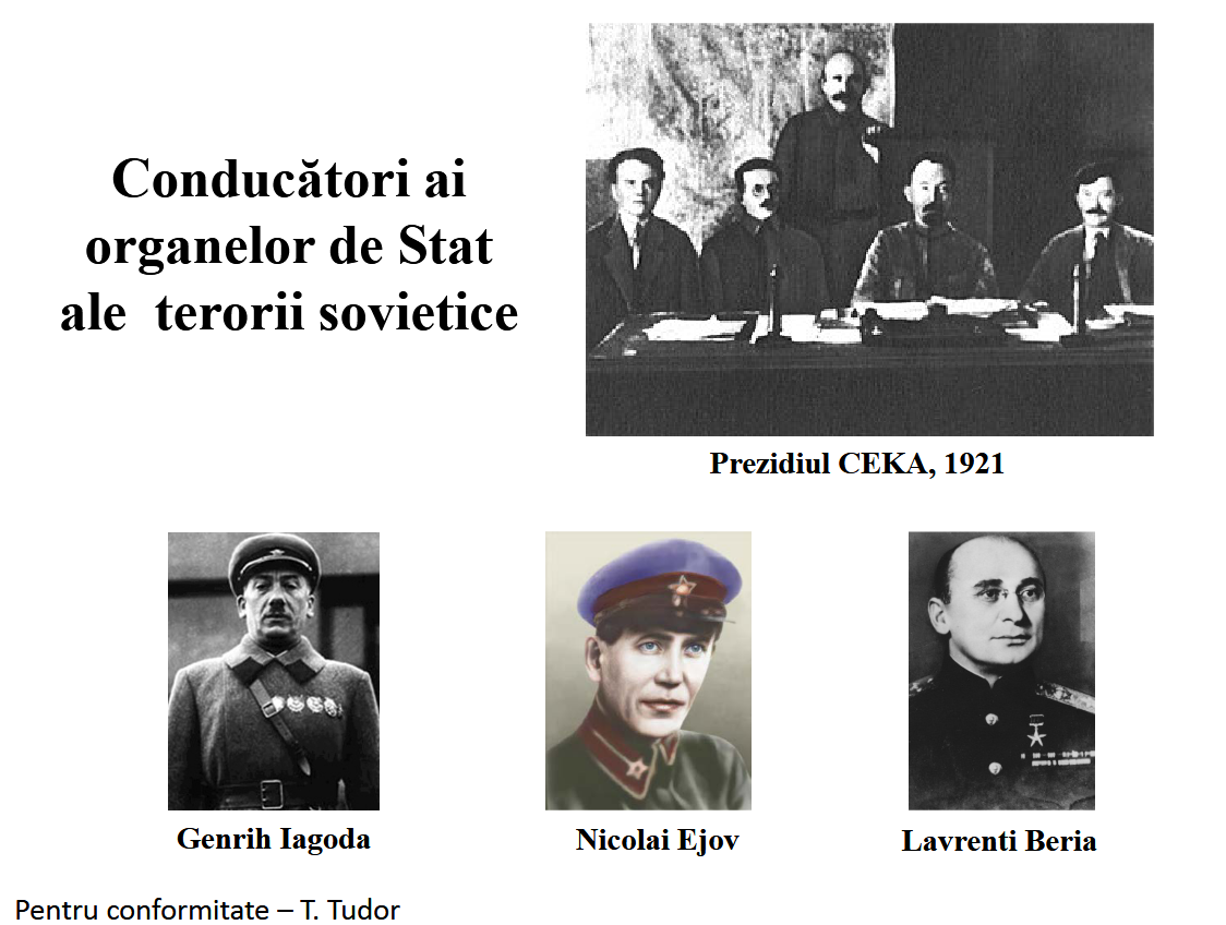 Toți cei care s-au opus, într-o formă sau alta, sovietizării, în toate republicile Imperiului Sovietic, au fost arestați, torturați, deportați, uciși, indiferent de naționalitate. De asemenea, conducerea organismelor terorii (bine cunoscute prin acronimele CEKA, GPU, OGPU, KGB, NKVD, etc.) era formată din bolșevici, indiferent de naționalitate. De exemplu, primul Prezidiu CEKA, la 1921, era constituit din Felix Dzerjinski, Viaceslav Menjinski – polonezi (de origine nobilă), Yakov Peters – leton, Josef Unzlicht, Abram Belenky- evrei (ultimii trei executați și ei în urma marii epurari staliniste din 1938). Cei mai sângeroși conducători ai NKVD-ului, GenrihYagoda (1934-1936) – evreu, Nicolai Ejov (1936-1938) – tatăl rus, mama lituaniancă, Lavrenti Beria (1938-1946) – georgian (toți trei executați, după ce au condus marile pogromuri ale acelor ani) (slide 2).
