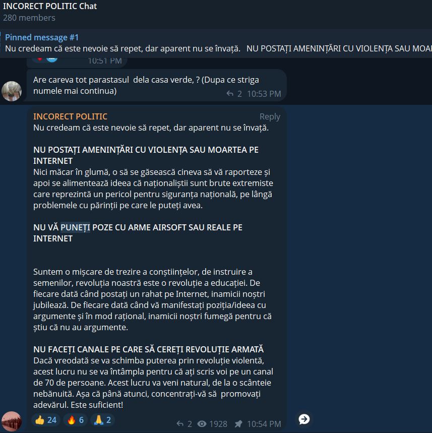 Acel mesaj a fost repetat pe parcurs de fiecare dată când cineva instiga la violență (persoane care erau eliminate de pe grup după un avertisment), ajungând să primească pin (să fie lipit pentru a fi mai vizibil).