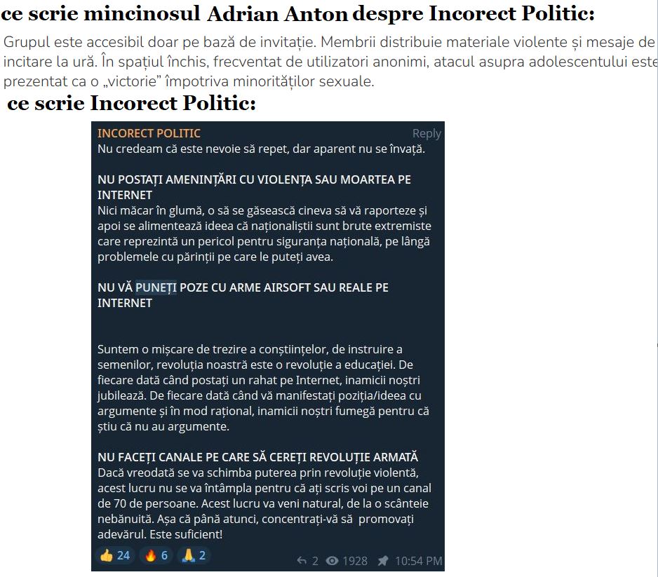 Vedeți cum funcționează manipularea? Ei folosesc un caz real, ca și cel al Unității 731, pe care lipesc o minciună, cum că grupul de telegram Incorect Politic Chat e un grup unde se promovează violența, minciună demontabilă foarte ușor cu un search la poza indicată mai sus. O mai pun odată aici, știind cât de proști sunt jurnaliștii și cât de greu înțeleg orice.