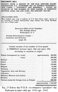 11. […] O „estimare prudentă a numărului de jidani gazaţi la Birkenau, între aprilie 1942 şi aprilie 1944“, rezumată sub forma unui tablou. Aceste cifre au fost utilizate în darea de seamă a procesului T.M.I. care a fost publicată. Noi le reproducem în ilustraţia n° 25 (partea I-a, p. 33) [cf. Fig. 25 – n.n., V.I.Z.].