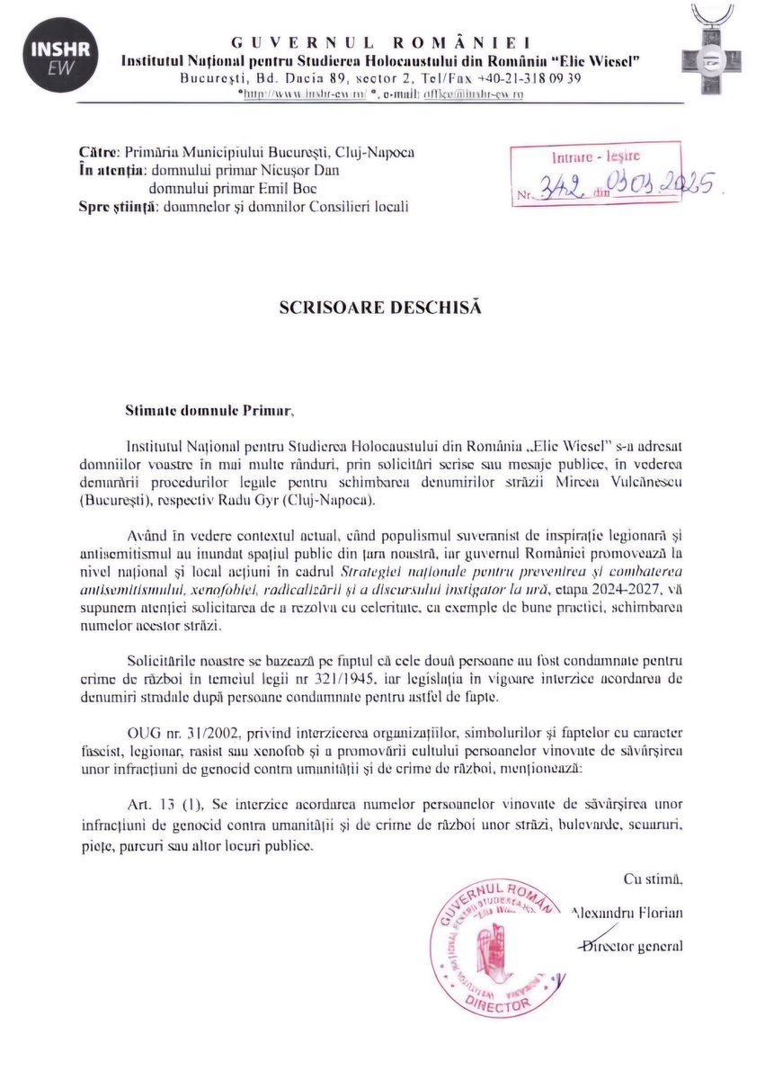 Scrisoarea deschisă este semnată de Alexandru Florian, director general INSHR „Elie Wiesel”.