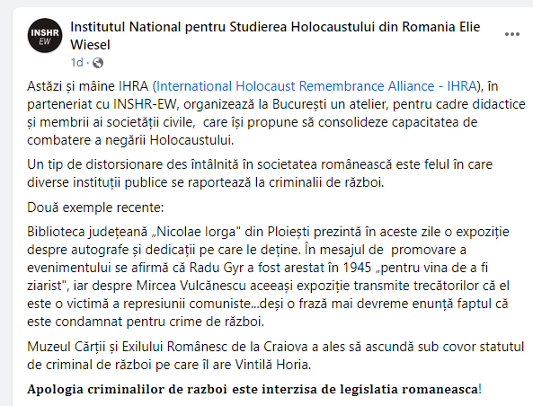 „Azi și mâine (adică miercuri și joi, n. n.) IHRA (International Holocaust Remembrance Alliance – IHRA), ȋn parteneriat cu INSHR-EW (Institutul National pentru Studierea Holocaustului din Romania Elie Wiesel), organizează la București un atelier, pentru cadre didactice și membrii ai societății civile, care ȋși propune să consolideze capacitatea de combatere a negării Holocaustului.