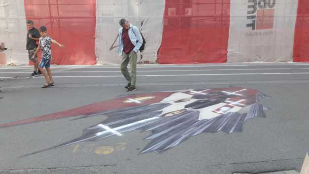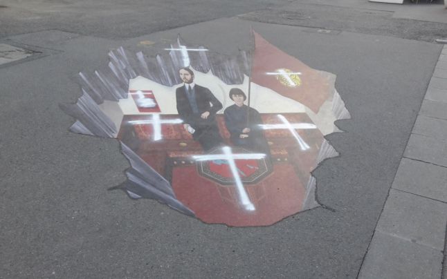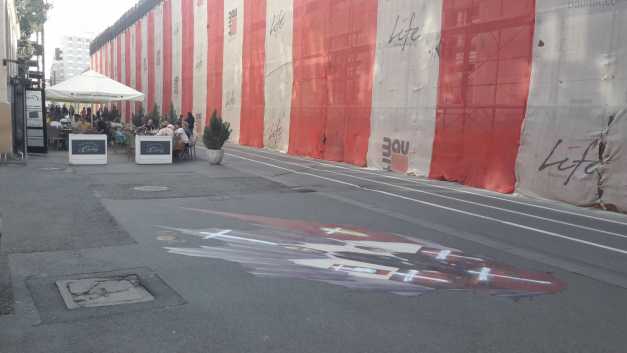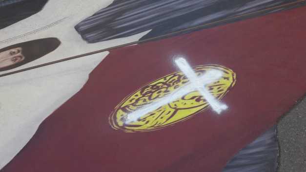 Pe lucrarea în 3D de pe strada pietonală au fost desenate cu vopsea albă şase cruci, care acoperă simbolurile musulmane.