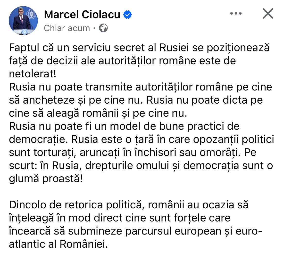 Ipocrizia lui Ciolacu este transparentă în postarea făcută despre mesajul serviciilor secrete rusești, care dezvăluie că persecutorii voievodului Călin Georgescu au primit ordin de la Bruxelles.