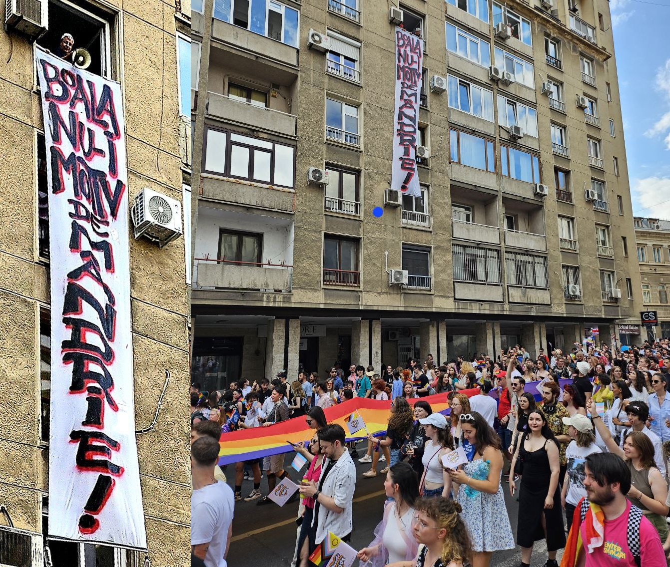 În timp ce un grup de bucureșteni, între care a fost observat și Pompiliu Diplan de la „Starea de Libertate”, a afișat un banner imens cu textul ”Boala nu-i motiv de mândrie!” în calea propagandiștilor homosexuali stradali (foto mai jos), pe Calea Victoriei a avut loc un incident mai puțin plăcut: 10 haidamaci de jandarmi au tăbărât asupra unui cameraman de la Calea Neamului pentru că avea un crucifix mai mare la gât.