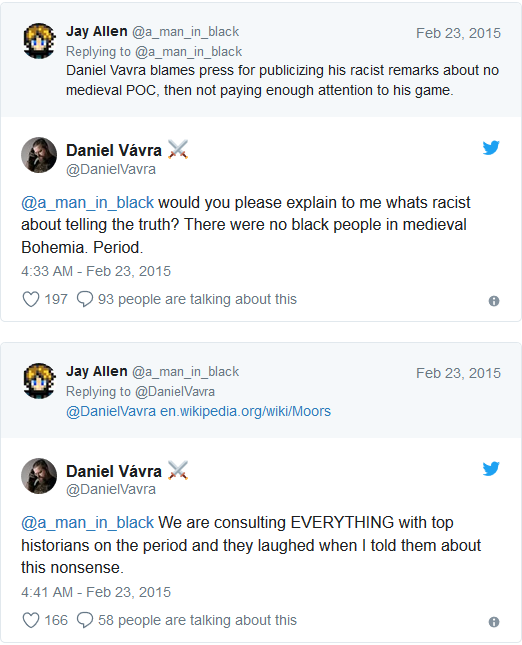 Mai exact i-a deranjat faptul că în joc nu apar negrotei, personaje de culoare, sau “cioroi”, cum ar zice unii; asta  în ciuda faptului că în Boemia vremurilor 1400 populația era albă și jocul este fidel din punct de vedere istoric.