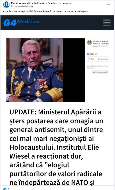 UPDATE: Ministerul Apărării a șters postarea care omagia un general antisemit, unul dintre cei mai mari negaționiști ai Holocaustului. Institutul Elie Wiesel a reacționat dur, arătând că ”elogiul purtătorilor de valori radicale ne îndepărtează de NATO și UE”