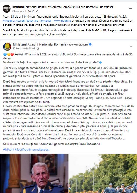 Articol inițial: Ministerul Apărării Naționale, condus de Vasile Dîncu (PSD), l-a omagiat printr-o postare pe Facebook pe generalul Radu Theodoru la împlinirea vârstei de 98 de ani. Theodoru, membru fondator al partidului extremist România Mare în anii 90, a publicat cărți (”România ca o pradă”) și articole în care neagă Holocaustul din România și promovează atitudini antisemite.