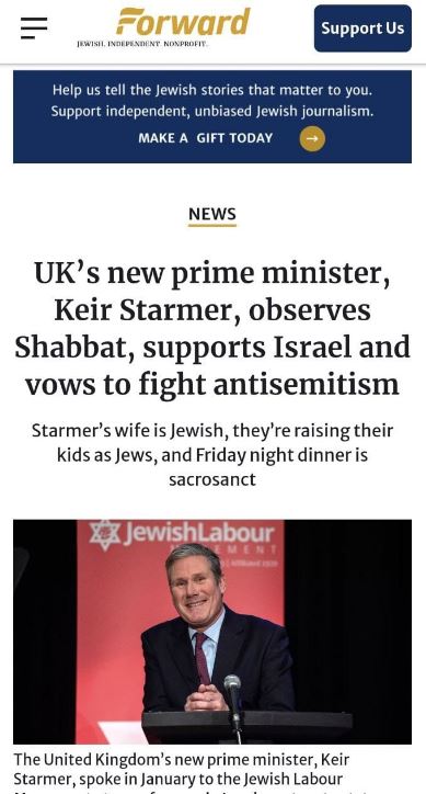 Keir Starmer, premierul Marii Britanii urmează sabatul, soția e iudeică, își cresc copiii în iudaism, susține Israelul și a jurat să combată antisemitismul.
