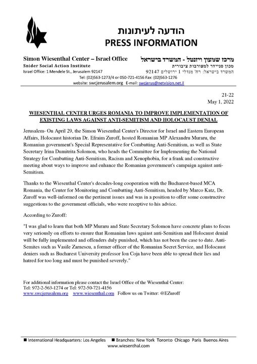 CENTRUL WIESENTHAL ÎNDEAMNA ROMÂNIA SĂ ÎMBUNĂTATEASCA IMPLEMENTAREA LEGISLATIEI EXISTENTA ÎMPOTRIVA ANTISEMITISMULUI ȘI NEGĂRII HOLOCAUSTULUI