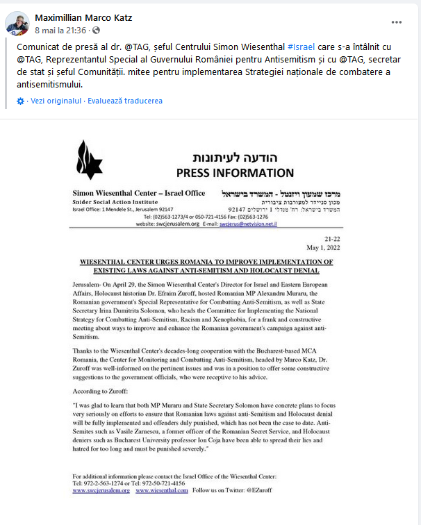 Datorită cooperării de zeci de ani a Centrului Wiesenthal cu MCA Romania, Centrul de Monitorizare și Combatere a Antisemitismului, condus de Marco Katz, Dr. Zuroff a fost bine informat cu privire la problemele existente și a fost în măsură să ofere sugestii constructive, adresate oficialilor guvernamentali, care au fost receptivi la sugestiile prezentate .