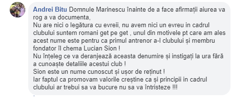 La scurt timp după postarea mea de pe Facebook, m-am trezit contrat de Andrei Bitu, președintele Clubului Sportiv Sion din Sibiu. Redau, mai jos, dialogul: