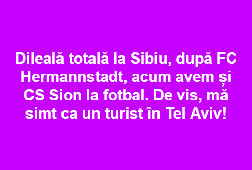 „Dileală totală la Sibiu, după FC Hermannstadt, acum avem și CS Sion la fotbal. De vis, mă simt ca un turist în Tel Aviv!” Am postat acest scurt text pe pagina mea de Facebook, după ce am citit într-o publicație locală că la Sibiu avem și un club de fotbal numit Sion, de parca nu era suficient Hermannstadt pentru bietul oraș, obligat să devină cosmopolit peste noapte prin demersurile câtorva lingăi, pupincuriști ai străinilor. (http://www.turnulsfatului.ro/2019/07/18/interviu-cu-andrei-bitu-scoala-de-fotbal-cs-sion-copiii-talentati-trebuie-promovati-si-sprijiniti/)