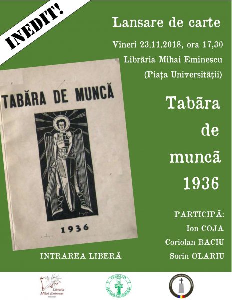 Vineri 23 noiembrie 2018, orele 17,30, la Librăria Mihai Eminescudin București (Piața Universității), va avea loc lansarea cărții TABĂRA DE MUNCĂ – 1936, în prezența prof. univ. Ion Coja, a președintelui Fundației Ion Gavrilă Ogoranu – dl Coriolan Baciu și a cercetătorului Sorin Olariu.
