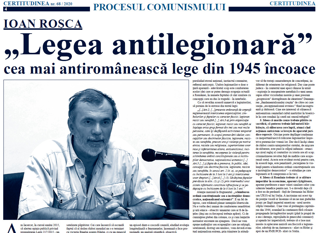 NOTA ISPRAVNICULUI: Acest articol este, de fapt, o selecție din două texte succesive ale lui Ioan Roșca, ambele apărute pe site-ul piatauniversitatii. com. Am eliminat, prin croșetele corespunzătoare, porțiunile care repetau ideile din textul anterior, sau care depășeau spațiul de tipar dedicat. Cele două texte sunt intitulate „Despre genocidul contra legionarilor cînd vorbim?”, respectiv „Ce idei legionare sunt interzise şi de ce?”.