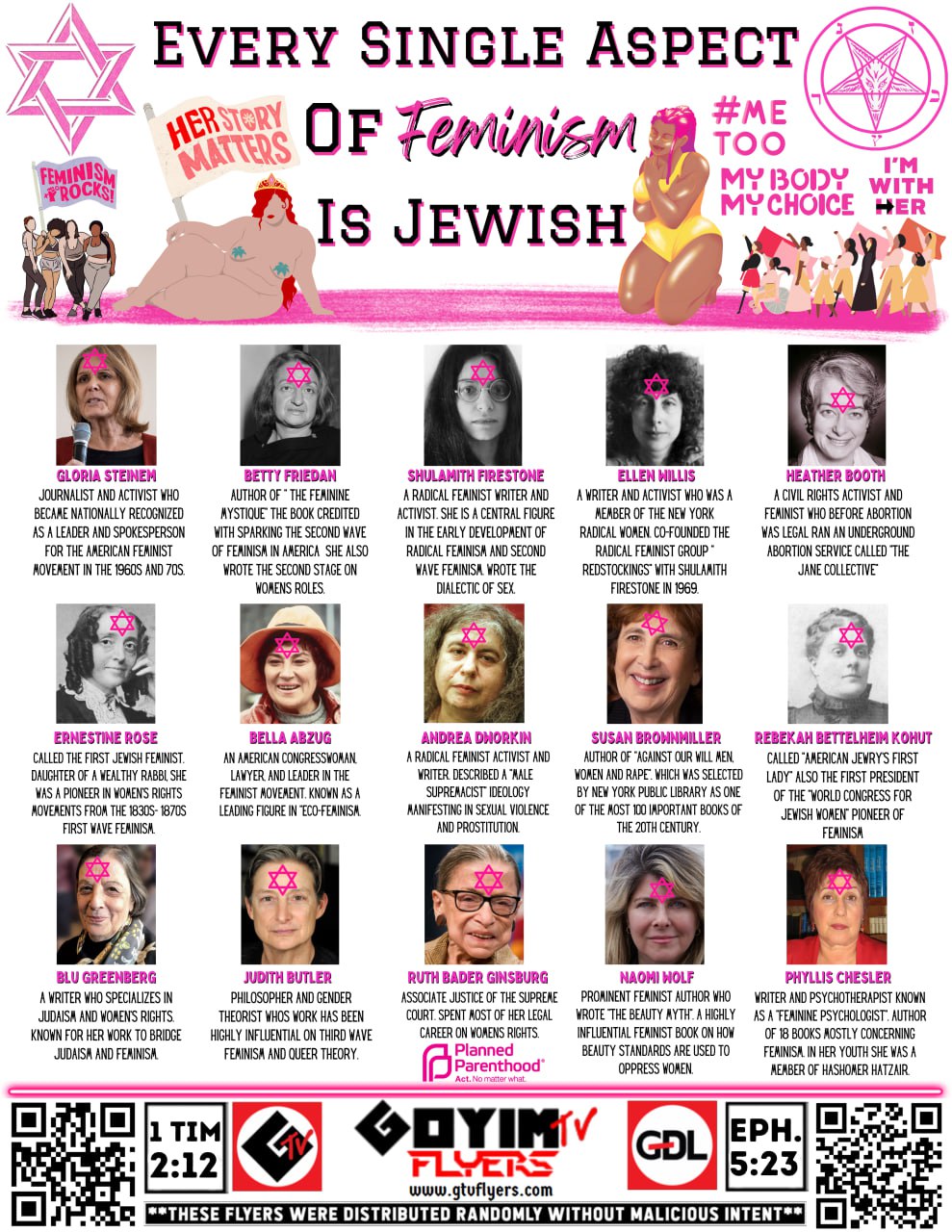 Ca multe alte curente iudeo-jidovești, feminismul jidănesc a depășit stricta comunitate iudeo-jidovească, însinuându-se în competiția dintre sexe și în toate cele omenești. Printre figurile feministe consacrate, printre homosexuali și reprezentanții teoriei genurilor întâlnim numeroși jidovi și jidoavce, precum Paulina Permutter Steinem (1864-1940), Gloria Steinem (născută în 1934), Ruth Bader Ginsburg (1933-2020), Judith Butler, feministă, lesbiană emerită, cu o bună educație religioasă, autoare a unor lucrări de teoria genurilor și paternitatea homosexuală.