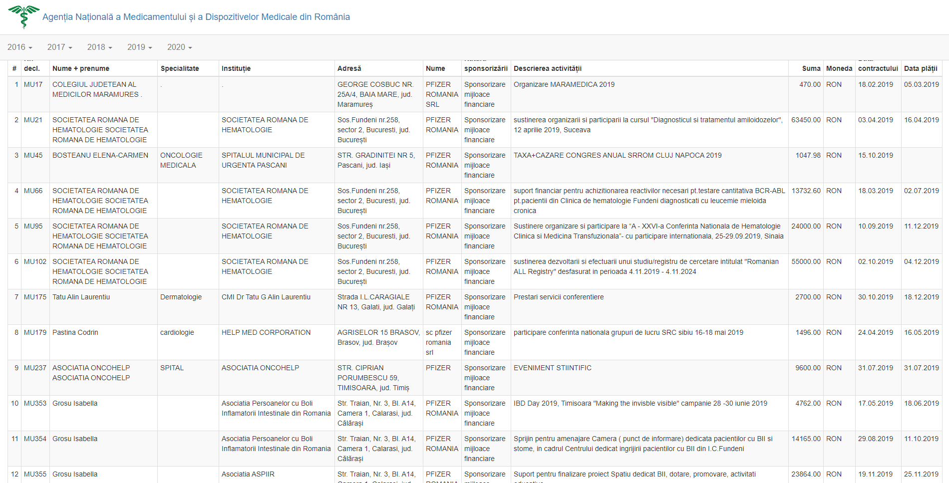 Mai jos puteți vedea toate instituțiile și toți medici care au primit bani sub formă de sponsorizare în anul 2019 de la Pfizer. Așteptăm lista pe anul 2020 să ne îngrozim.