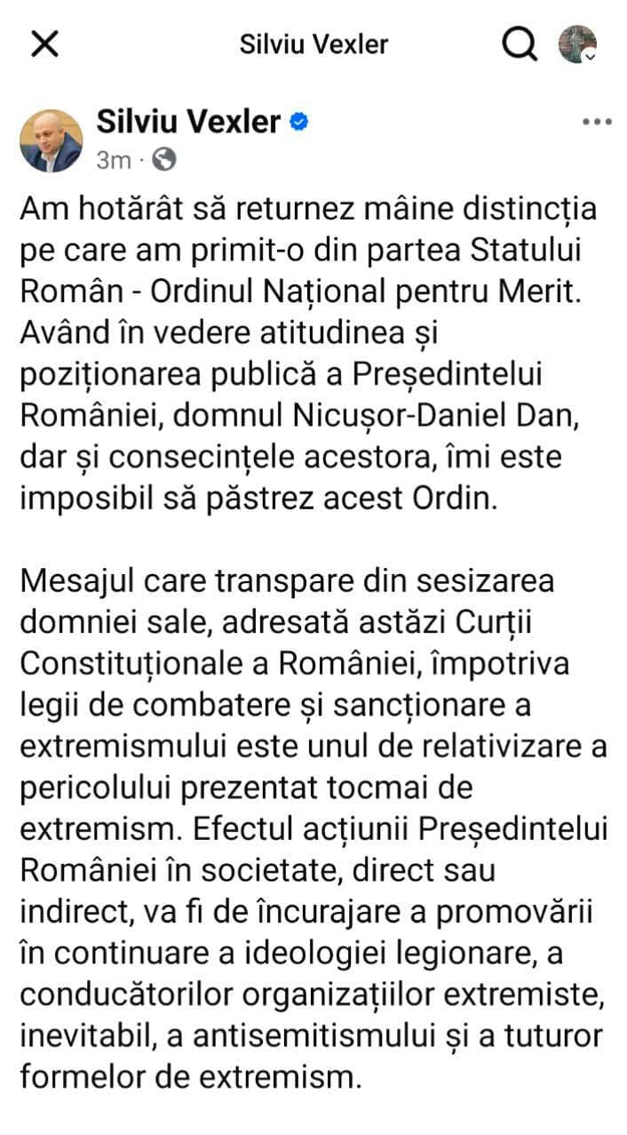 Mai țineți minte că tot atunci, Silviu Vexler a anunțat că își returnează decorația primită de președenția României? Oare ce va face acum că Nicușor Dan a trimis legea la reexaminare? Își va ceda și cetățenia?