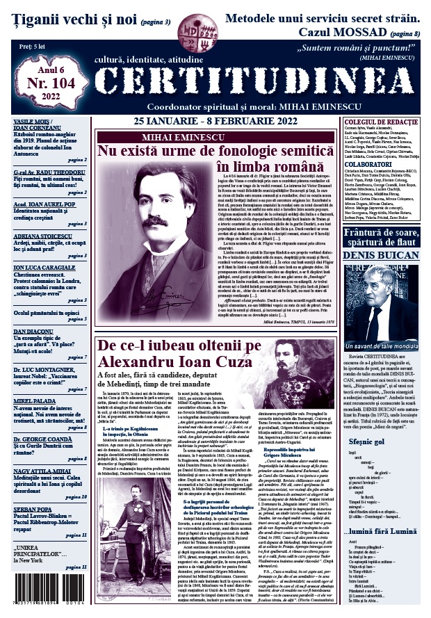 Pentru că mereu, pe prima pagină a acestui ziar, Certitudinea, se află cuvântul de necontestat al poetului Mihai Eminescu – primul nostru gazetar de geniu. Și, ca orice geniu, deranja atât de mult încât a făcut posibilă exprimarea: „Mai potoliți-l pe Eminescu o dată!”