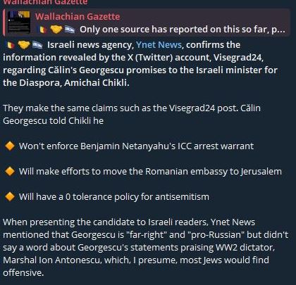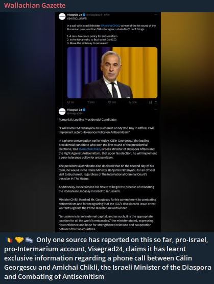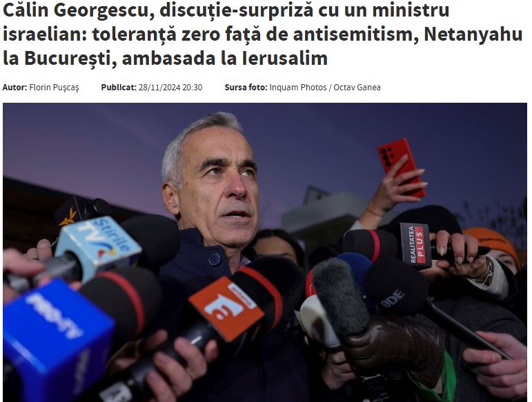 “Candidatul independent Călin Georgescu, câștigătorul primului tur al alegerilor prezidențiale, a promis Israelului că dacă va ajunge Președinte va muta ambasada României la Ierusalim și va aplica toleranță zero față de antisemitism” -acum spunem doar ca “v-am spus”, dupa 8 decembrie altfel ne vom exprima….