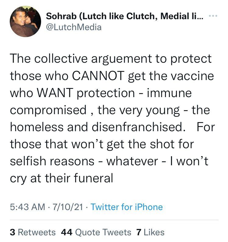 “Pentru cei care nu vor să se vaccineze din motive egoiste – indiferent de ce – nu voi plânge la înmormântarea lor”, a scris Dr. Lutchmedial pe Twitter în iulie.
