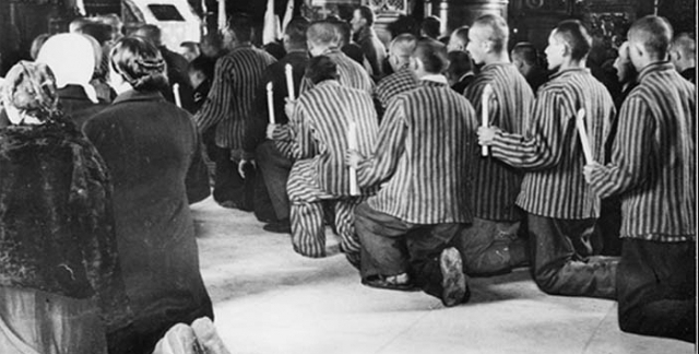 Legionari în uniformă purtân stindarde creștine alături de preoți.