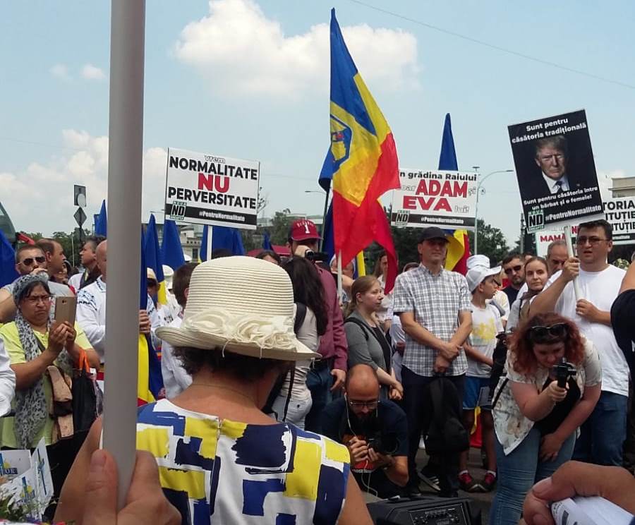 Pe parcurs, participanții au scandat: Dumnezeu a dat/femeie si barbat, Romania e profamilie. Partenerit civil/ dute’n exil, ale, ale, ale/ poponare lasă-ne.