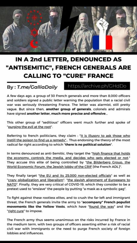 În România a trecut aproape neobservată o scrisoare deschisă a militarilor francezi aflaţi în rezervă. Scrisoarea a fost publicată mai întâi pe 14 aprilie 2021 pe un blog (Place d’Armes) şi a fost reluată de săptămânalul conservator „Valeurs actuelles”. „Tribuna” militarilor rezervişti a fost redactată şi semnată de căpitanul Jean-Pierre Fabre-Bernadac, fost ofiţer „de l’Armée de Terre et de la Gendarmerie”, autor a nouă cărţi. Marţi 27 aprilie 2021, luarea de poziţie a militarilor rezervişti era deja contrasemnată de 30 de generali şi 2.500 de militari de alte grade (după Ulysse Gosset, editorialist de politică internaţională, citat de Patrick Sauce şi Clarisse Martin la bfmtv.com).